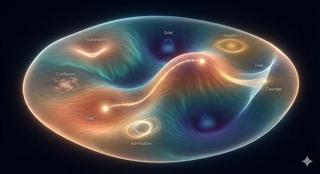 Imagine two agents in conversation. When trust is low, the relational space between them is flat and vast. Every step toward mutual understanding requires significant effort. Signals get lost. Intentions get misread. But as trust builds, something remarkable happens: the space itself begins to curve. High trust creates high curvature, and high curvature draws agents together. Small signals produce large effects. Understanding becomes easier because the geometry of the relationship is doing some of the work.