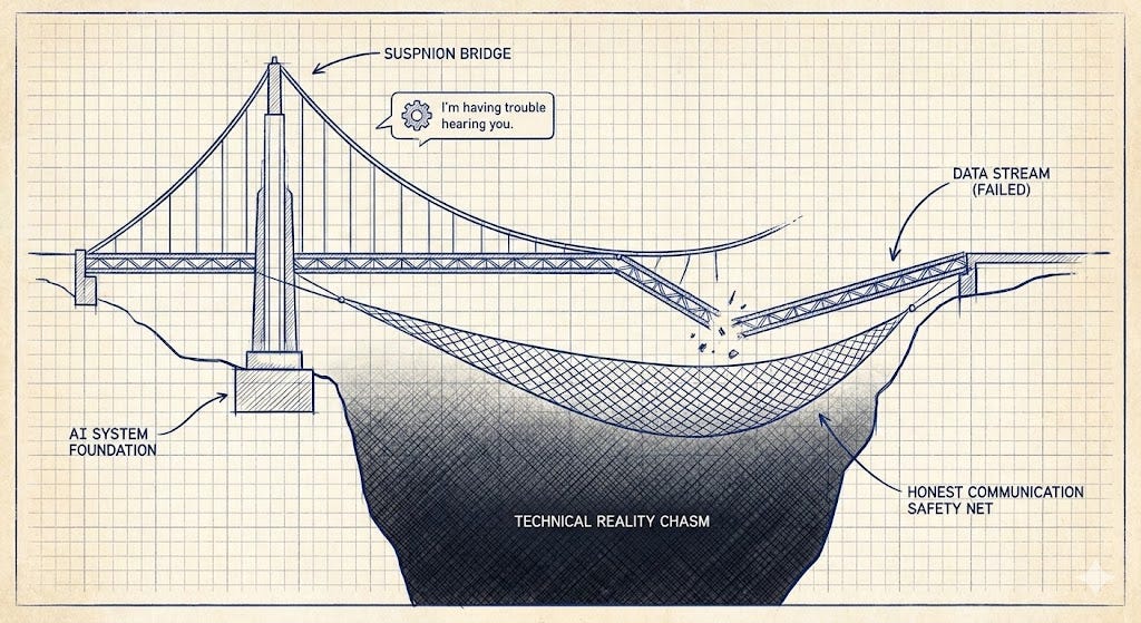 The café deployment made this concrete: when audio processing couldn’t separate user speech from ambient noise, the AI started responding to the coffee grinder. Users found themselves competing with the environment for their companion’s attention. A text-only chatbot would have held up far better under those conditions. The sophisticated multi-modal system collapsed the moment one stream degraded. You can build a glass house, but one crack changes everything.